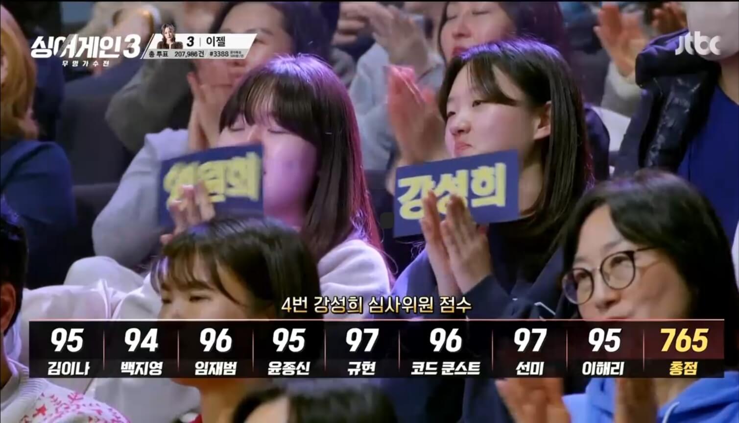 대단한 성량과 감동적인 무대를 보여준 강성희는 고른 고득점을 받아 765점을 받았으며 최종 합산 6등으로 마무리 하였습니다.