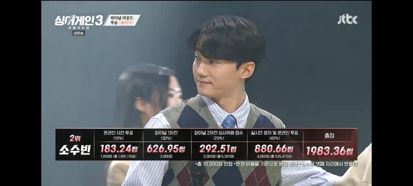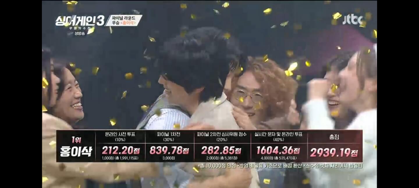 매 라운드마다 완성도 높은 무결점의 멋진 무대를 보여주었던 홍이삭은 파이널2차 무대에서는 고음에서 조금 흔들리는 모습을 보여 아쉬움을 남겼지만, 온라인 사전투표와 파이널1차전, 실시간 문자 및 온라인 투표에서 강력한 1위후보 소수빈에 훨씬 앞서 당당하게 1위로 우승하게 되었습니다.