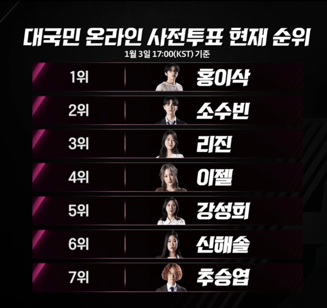 사전 온라인 투표 현재 순위는 다음과 같습니다. 좋아하는 후보가 우승까지 갈 수 있도록 꼭 사전 투표 바랍니다.