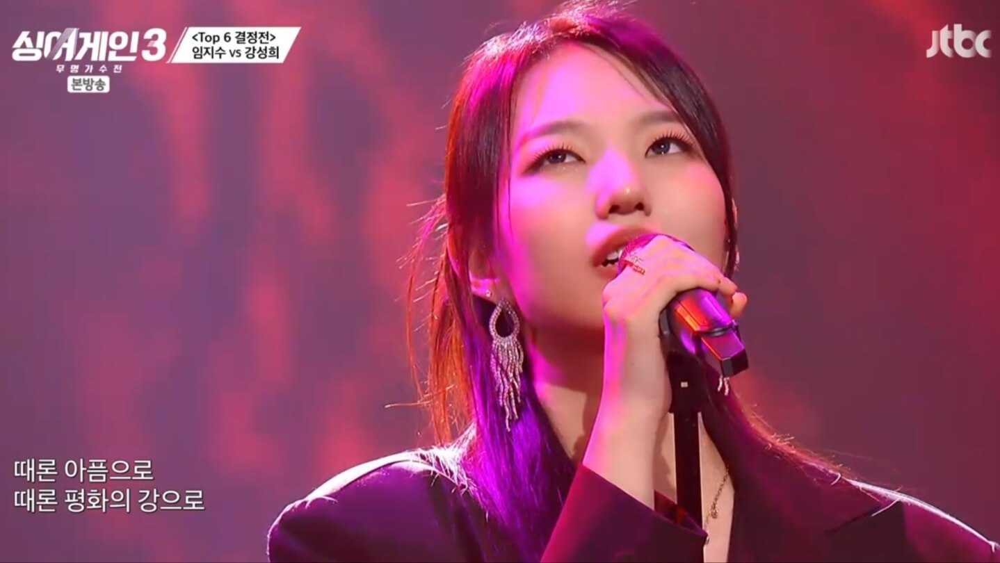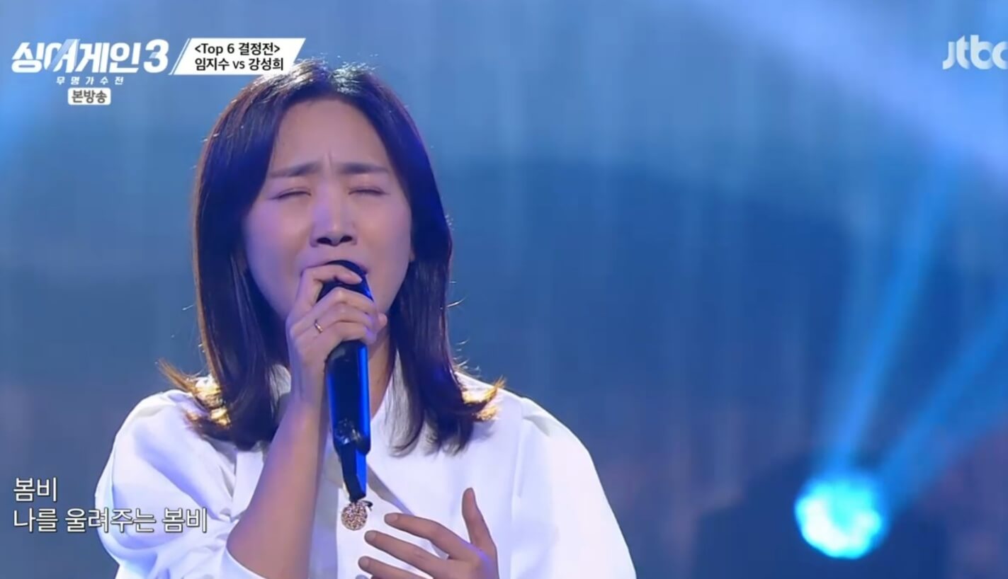 남아있는 마지막 대결은 '루씰'을 부르며 묵직한 저음보이스로 블루스의 진수를 보여준 임지수와 '봄비'를 부르며 폭발적인 가창력을 보여준 강성희의 대결이었습니다. 결과는 강성희가 7어게인으로 1어게인을 받은 임지수를 압도적으로 이기고 탑6에 진출할 수 있었습니다.