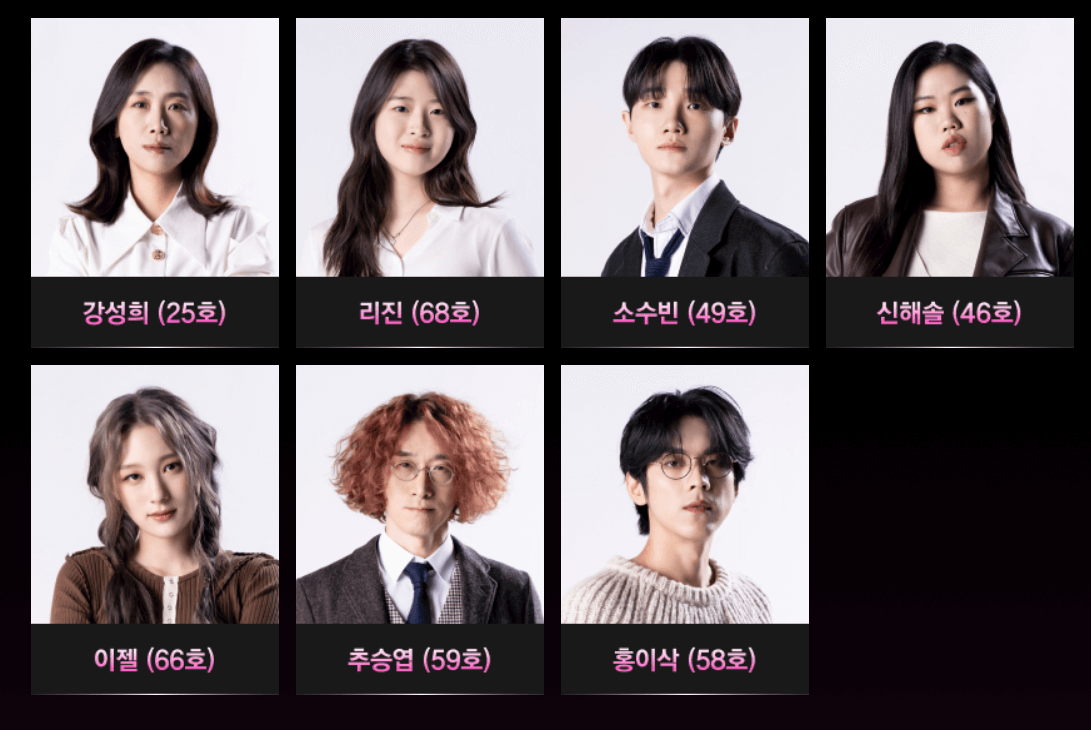 강성희, 리진, 소수빈, 신해솔, 이젤, 추승엽, 홍이삭 입니다!!